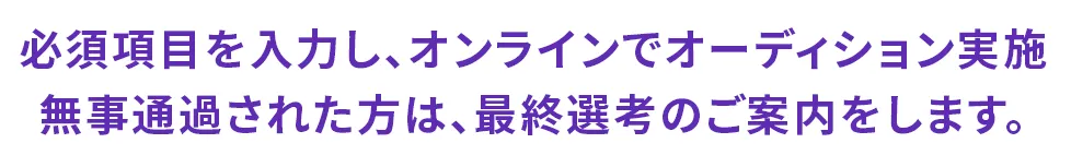 メニュー オーディション概要 運営会社について 所属クリエイター 合格特典 応募資格について オーディションの流れ よくあるご質問 今すぐ無料エントリー 無料エントリー 今すぐ無料エントリー ※所属クリエイターの一部をご紹介 今すぐ無料エントリー Ⓠ.SNS投稿の経験がなくても大丈夫? はい!問題ありません。未経験者でもチャンスは平等に御座いますので、安心してご参加ください。 Ⓠ.地方在住ですが、応募は可能ですか? 日本全国どこでも応募を受け付けております。オンラインで審査を行いますので、まずは気軽にエントリーして下さい! Ⓠ. 書類・動画審査って具体的にどんな事? 簡単なあなたの情報と、10~30秒程度の動画を送るだけ!動画撮影内容は「SNSを通じてどのように活躍したいか」・「私のこの特技を見てほしい」など。あなたの熱い気持ちを是非表現してください!スタッフが丁寧に一人一人を審査致します。 Ⓠ. 費用はかかりますか? オーディション参加において費用は発生しませんので、お気軽にご応募ください。プログラムへの参加が決定した場合、一定の費用(マネジメント費用等)をご負担いただきます。 審査過程の交通費・諸費は個人負担となります 未成年の方は保護者の同意の上、ご応募下さい 必ず候補者の同意を得てご応募ください LINEで連絡が取れない場合は、選考ストップ オーディション時は録音・撮影は禁止です 事務所への直接訪問は一切お断りしております 審査合格者からは当社規定のマネジメント費をいただく場合がございます。 エントリー前の疑問点・相談など 気になる点はお気軽にお問合せ下さい お問い合わせはコチラ ご入力いただいた情報に個人情報が含まれる場合には、当該情報は、当社プライバシーポリシー(URL)に則って管理させていただきます。情報をご入力いただく前に、当社プライバシーポリシーをご確認いただくようお願いいたします。 プライバシーポリシー プライバシーポリシー| 重要事項に関する表示 © BitStar-Audition運営事務局
